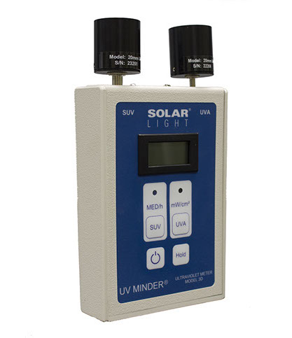 Model 3D UV Minder® Intensity Meter accurately measures the UVA and UVB spectra with its on-board UVA and UVB sensors. The meter shows the intensity of UVB (also called SUV – Sunburning UV) in Minimal Erythemal Doses per Hour (MED/Hr), the accepted clinical measure for sunburn potential. The UVA sensor measures UV intensity in the 320-400nm range, displaying UVA irradiance in mW/cm2. We also offer a special Model 3D-XP Xeroderma Erythemal UV Intensity Meter for measuring very low UV intensity, down to 3 decimal places, for XP patients. Please specify wavelength range required when ordering. The 3D meter is durable, simple to use, and extremely accurate.